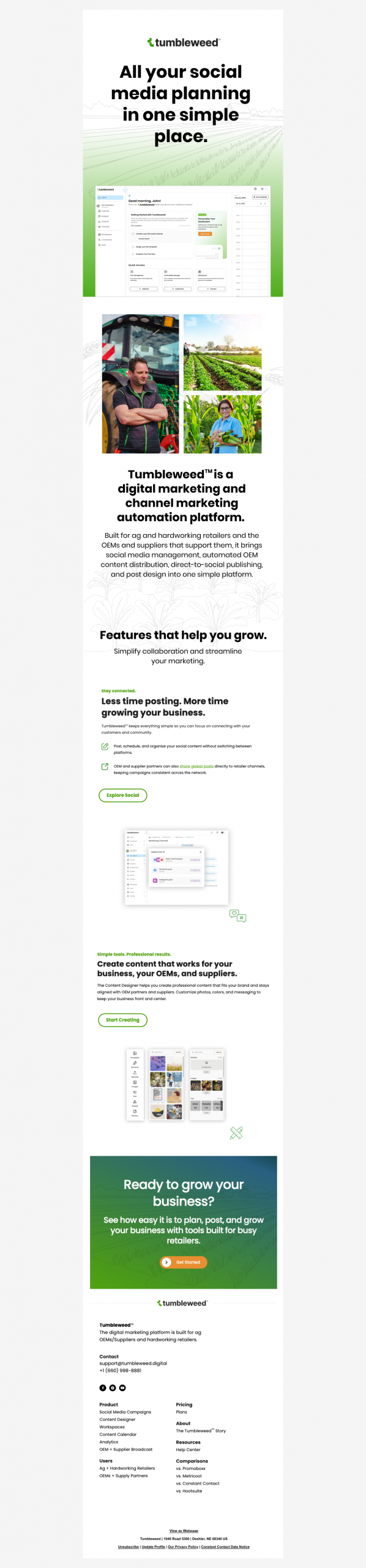 TumbleweedTM is a digital marketing and channel marketing automation platform built for ag and hardworking retailers and the OEMs and suppliers that support them. It combines social media management, automated OEM content distribution, and direct-to-social publishing with a built-in content designer that lets users create posts using templates, photo libraries, and simple tools designed for everyday retail teams.